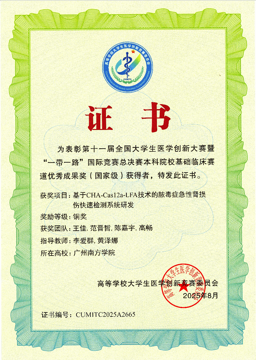 2025年8月,我院李爱群、黄泽娜老师在第十一届全国大学生医学创新大赛暨“一带一路”国际竞赛总决赛本科院校基础临床赛道带领团队荣获铜奖。