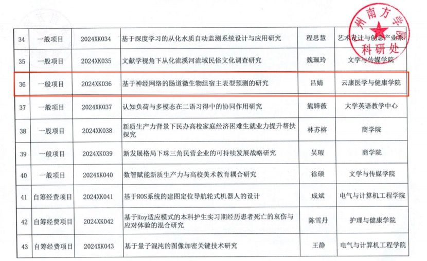 吕婧老师的项目《基于神经网络的肠道微生物组宿主表型预测的研究》申报立项了2024年度校级科研项目。
