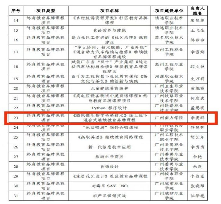 李爱群副教授的项目<《临床微生物学检验技术》线上线下混合式继续教育品牌课程>申报立项了2024年度广东省学习型社会建设(继续教育)质量提升工程项目。