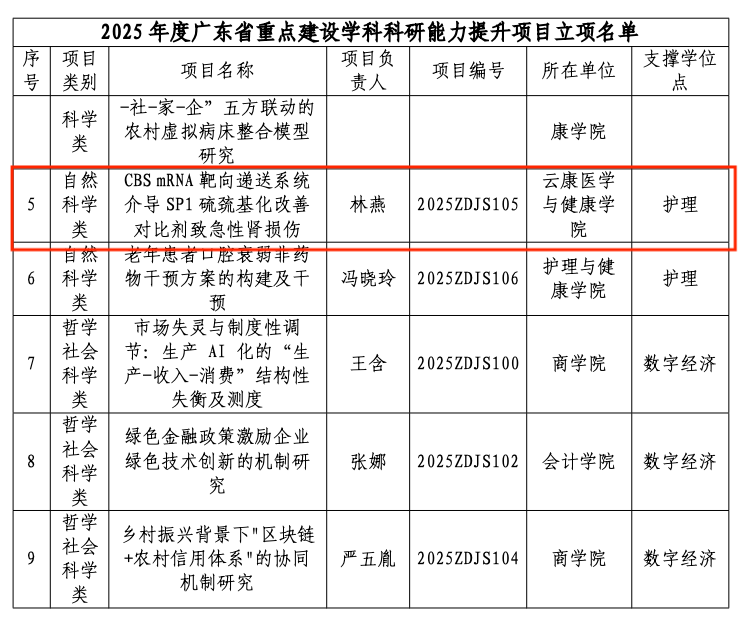 林燕教授项目《CBS mRNA靶向递送系统介导SP1硫巯基化改善对比剂致急性肾损伤》申报立项了2025年广东省重点建设学科科研能力提升项目。