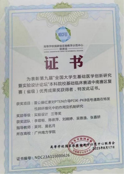 第九届全国大学生基础医学创新研究暨实验设计论坛本科院校基础临床赛道中南赛区复赛三等奖
